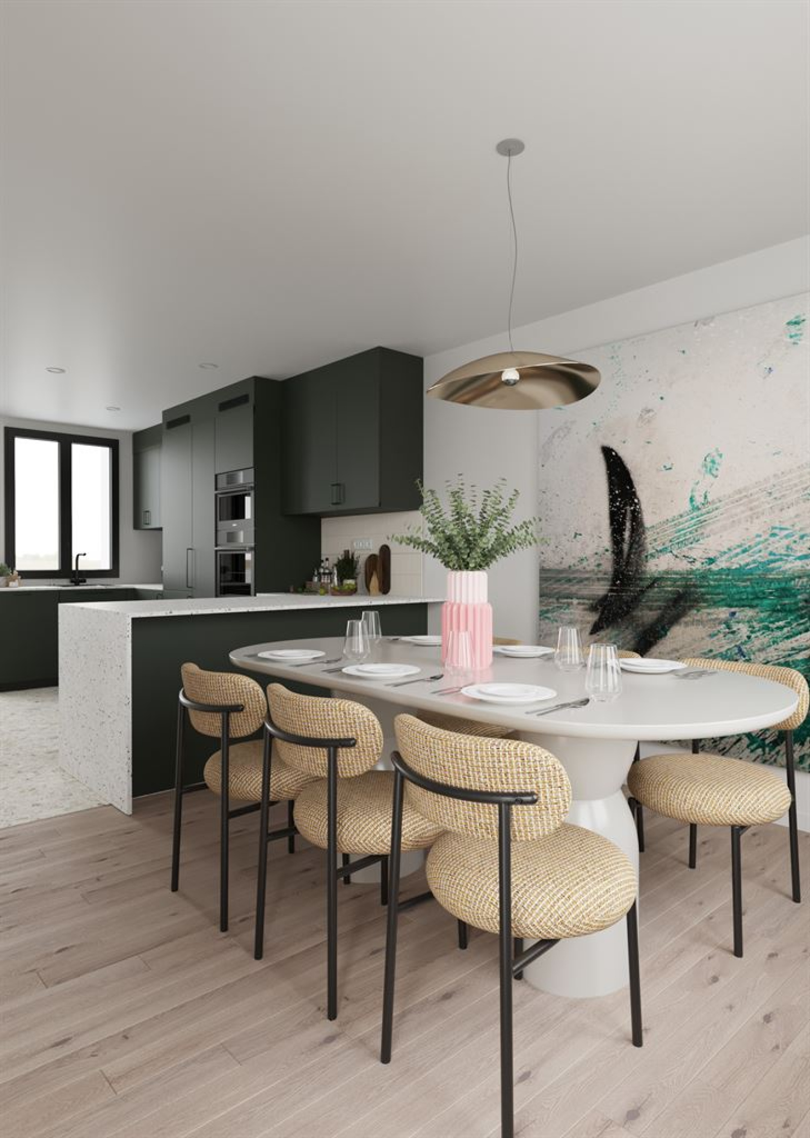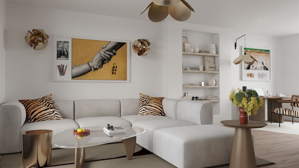 Au premier étage, un superbe espace de réception composé d’une cuisine ouverte sur la salle à manger et d’un séjour baigné de lumière, s’ouvrant naturellement sur les deux terrasses.